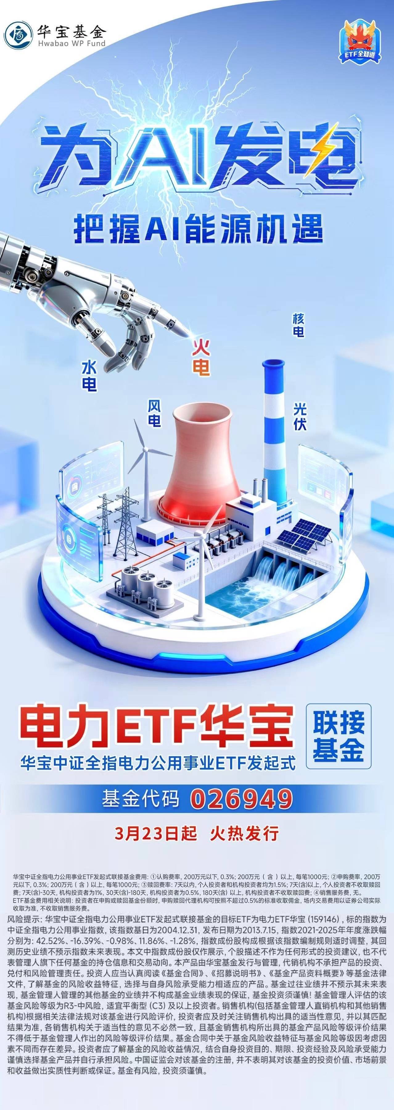 风险提示:电力ETF华宝联接基金(026949)的目标ETF为电力ETF华宝(159146),标的指数为中证全指电力公用事业指数,该指数基日为2004.12.31,发布日期为2013.7.15,指数2021-2025年年度涨跌幅分别为:42.52%、-16.39%、-0.98%、11.86%、-1.28%,指数成份股构成根据该指数编制规则适时调整,其回测历史业绩不预示指数未来表现。本文中指数成份股仅作展示,个股描述不作为任何形式的投资建议,也不代表管理人旗下任何基金的持仓信息和交易动向。本产品由华宝基金发行与管理,代销机构不承担产品的投资、兑付和风险管理责任。投资人应当认真阅读《基金合同》、《招募说明书》、《基金产品资料概要》等基金法律文件,了解基金的风险收益特征,选择与自身风险承受能力相适应的产品。基金过往业绩并不预示其未来表现,基金管理人管理的其他基金的业绩并不构成基金业绩表现的保证,基金投资须谨慎!基金管理人评估的电力ETF华宝联接基金(026949)、电力ETF华宝(159146)基金风险等级为R3-中风险,适宜平衡型(C3)及以上投资者。销售机构(包括基金管理人直销机构和其他销售机构)根据相关法律法规对该基金进行风险评价,投资者应及时关注销售机构出具的适当性意见,并以其匹配结果为准,各销售机构关于适当性的意见不必然一致,且基金销售机构所出具的基金产品风险等级评价结果不得低于基金管理人作出的风险等级评价结果。基金合同中关于基金风险收益特征与基金风险等级因考虑因素不同而存在差异。投资者应了解基金的风险收益情况,结合自身投资目的、期限、投资经验及风险承受能力谨慎选择基金产品并自行承担风险。中国证监会对该基金的注册,并不表明其对该基金的投资价值、市场前景和收益做出实质性判断或保证。基金有风险,投资须谨慎。